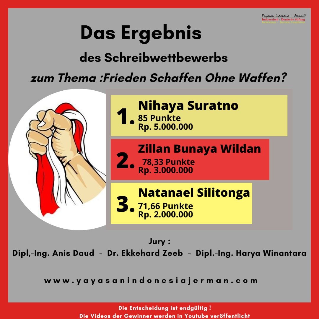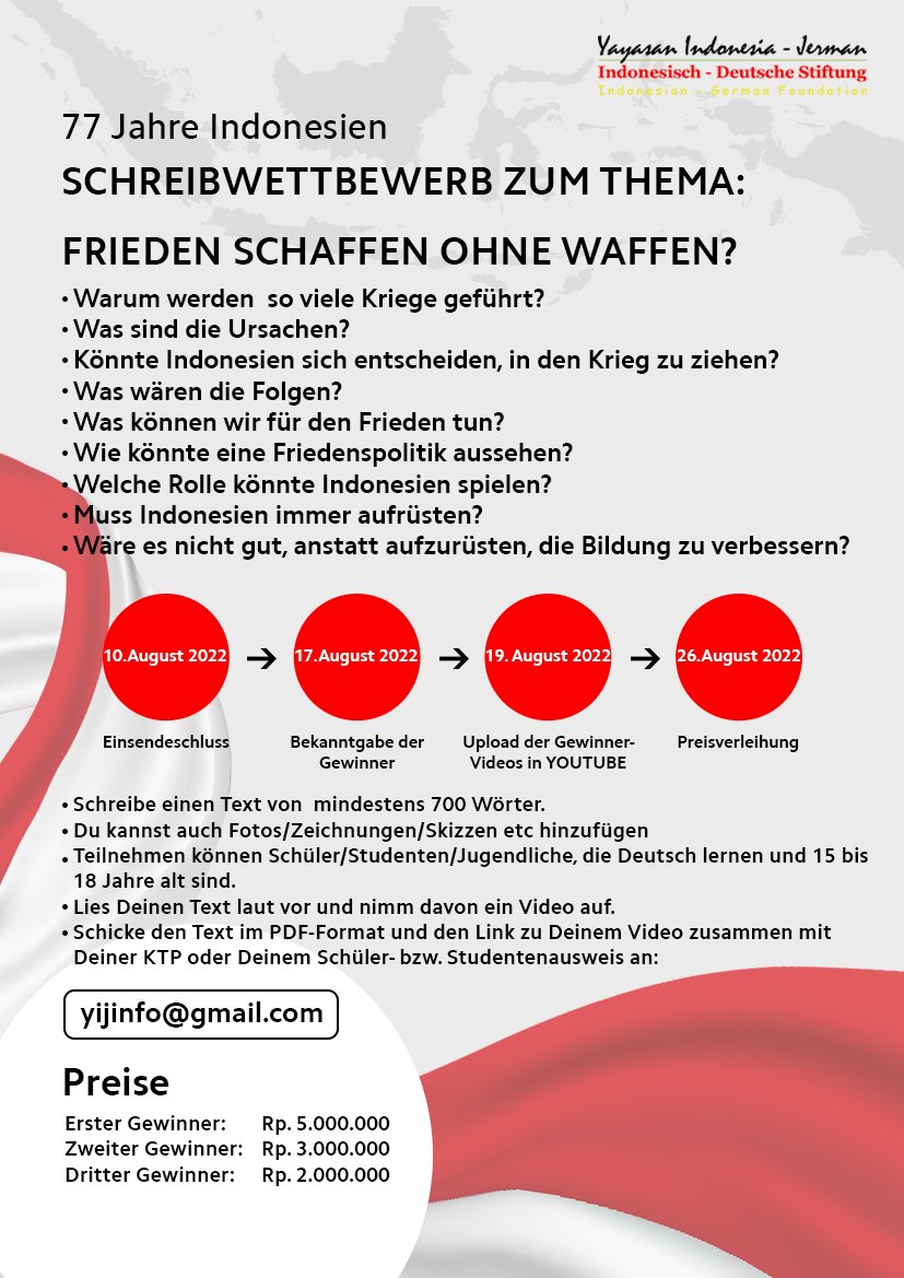 Hi Semua! dalam rangka menyambung HUT RI yang ke 77, kami menyelenggarakan lomba menulis Essay dalam bahasa Jerman loh! ikutan ya! hadiahnya menarik! jutaan loh!