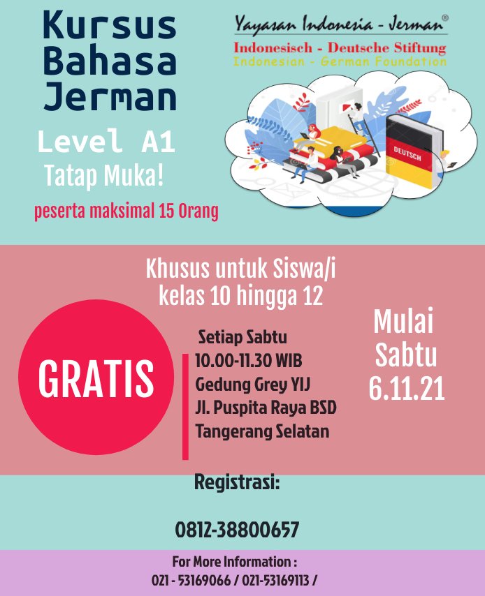 Hi semua! kami kembali mengadakan Kursus Bahasa Jerman level A1 Gratis selama 1 bulan! yuks gabung belajar bersama kami!