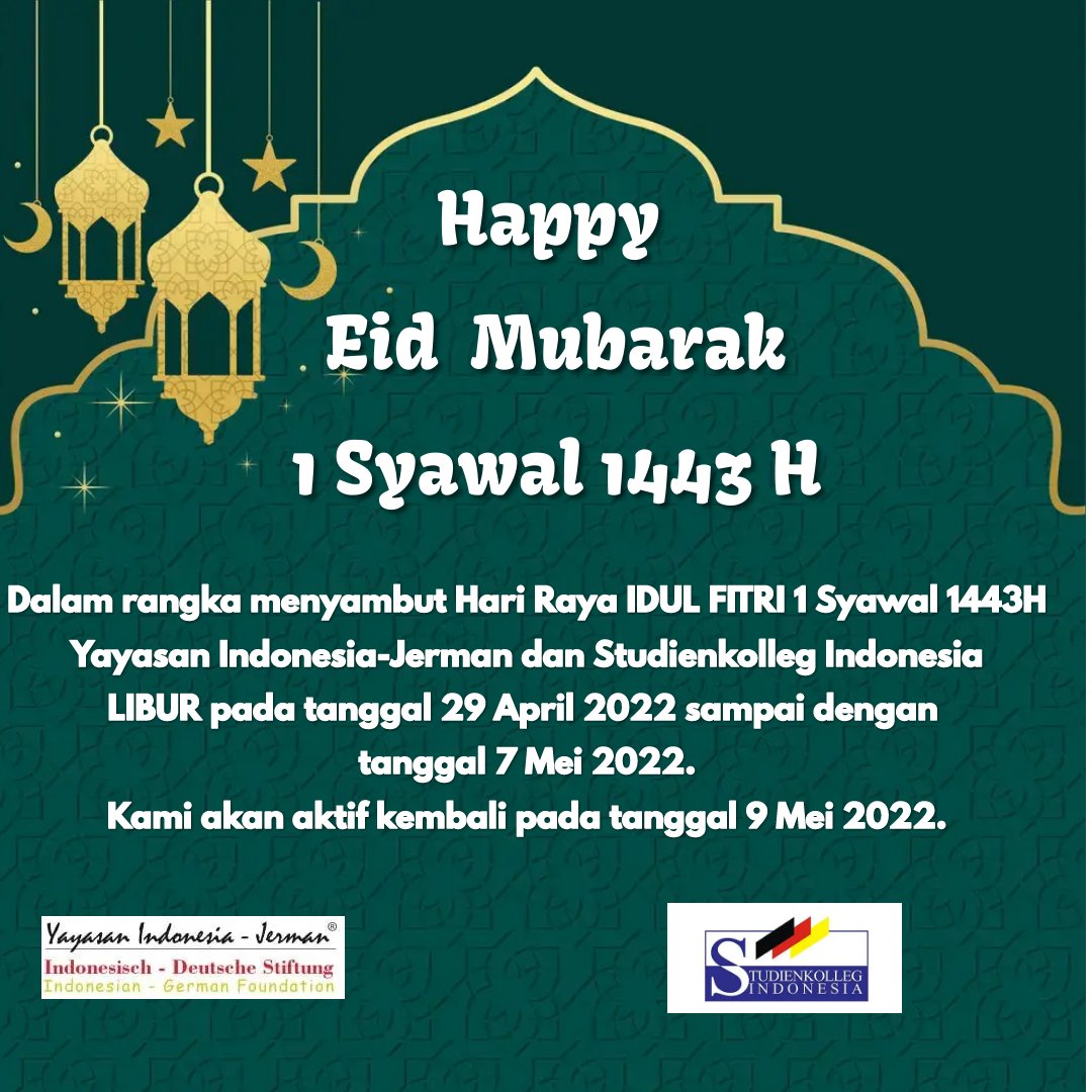 Liburan Hari Raya Idul Fitri Posted by Admin YIJ Categories Uncategorized Date April 25, 2022 Comments 0 comment Facebook Twitter LinkedIn Google+ StumbleUpon Pinterest Shares Dalam Rangka hari raua Idul Fitri, Kami akan libur dari tanggal 29 April 2022-7 Mei 2022. Kami akan aktif kembali pada tanggal 7 Mei 2022. Share: Admin YIJ Previous post Kelas Persiapan Ujian Masuk Studienkolleg April 25, 2022 Next post Life is Good May 7, 2022 You may also like Open House August 7, 2025 Road Map to Germany July 4, 2025 Kelas Persipaan Ujian Masuk Studienkolleg June 24, 2025