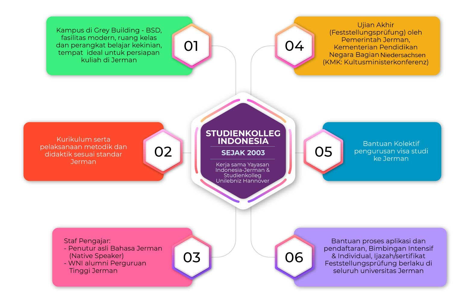 Studienkolleg Indonesia berdiri sejak tahun 2003, merupakan hasil kerja sama Jerman-Indonesia antara dua mitra, yakni Yayasan Indonesia-Jerman dan Studienkolleg Universitas Leibniz Hannover di Negara Bagian Niedersachsen. Studienkolleg Indonesia kini telah memiliki fasilitas gedung sendiri, Grey Building berada di Bumi Serpong Damai (BSD), dan merupakan satu-satunya Studienkolleg yang berada di luar Jerman.